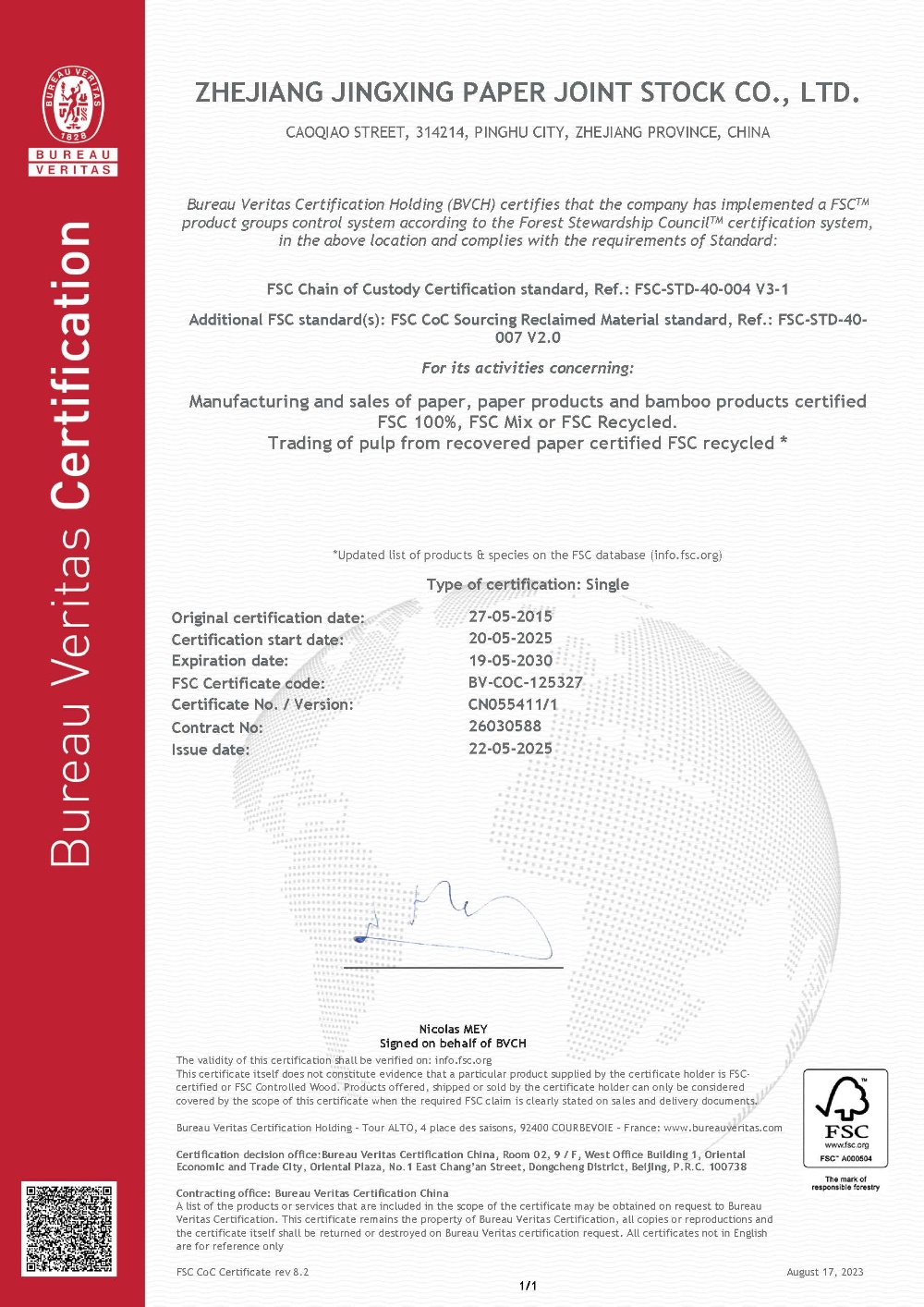景興紙業(yè)于1996年率先在同行業(yè)通過ISO9001質(zhì)量管理體系認(rèn)證,2002年通過ISO14001環(huán)境管理體系認(rèn)證,2014年通過OHSAS18001職業(yè)健康安全管理體系認(rèn)證,2015年通過GB/T23331能源管理體系和FSC?森林體系認(rèn)證,2018年通過兩化融合管理體系認(rèn)證。